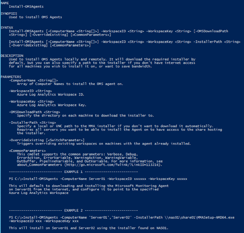 Install-OMSAgents -ComputerName 'Server01','Server02' -InstallerPath \\nas01\share01\MMASetup-AMD64.exe -WorkspaceID xxx -WorkspaceKey xxx