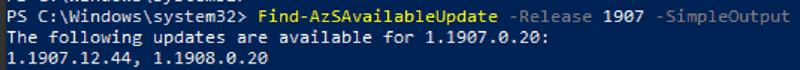 Find-AzSAvailableUpdate -Release 1907 -SimpleOutputThis will return the results as a simplified string, showing the update versions that need to be applied.