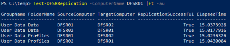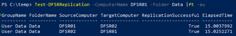 Test-DfsrReplication -ComputerName DFSR01 | ft -au