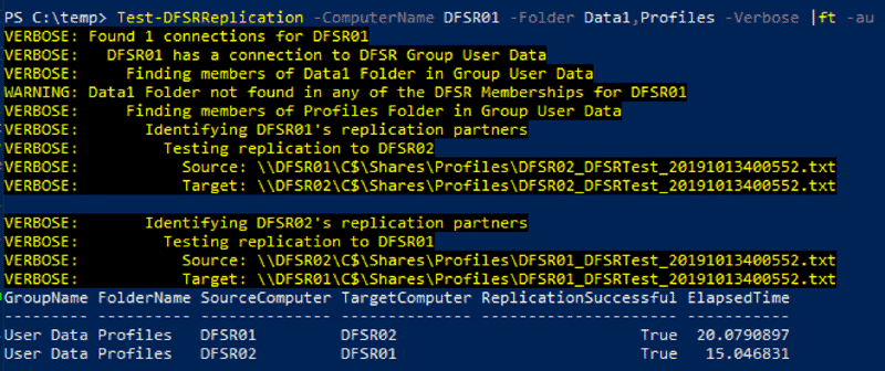 Test-DfsrReplication -ComputerName DFSR01 -Folder Data1,Profiles -Verbose | ft -au<
