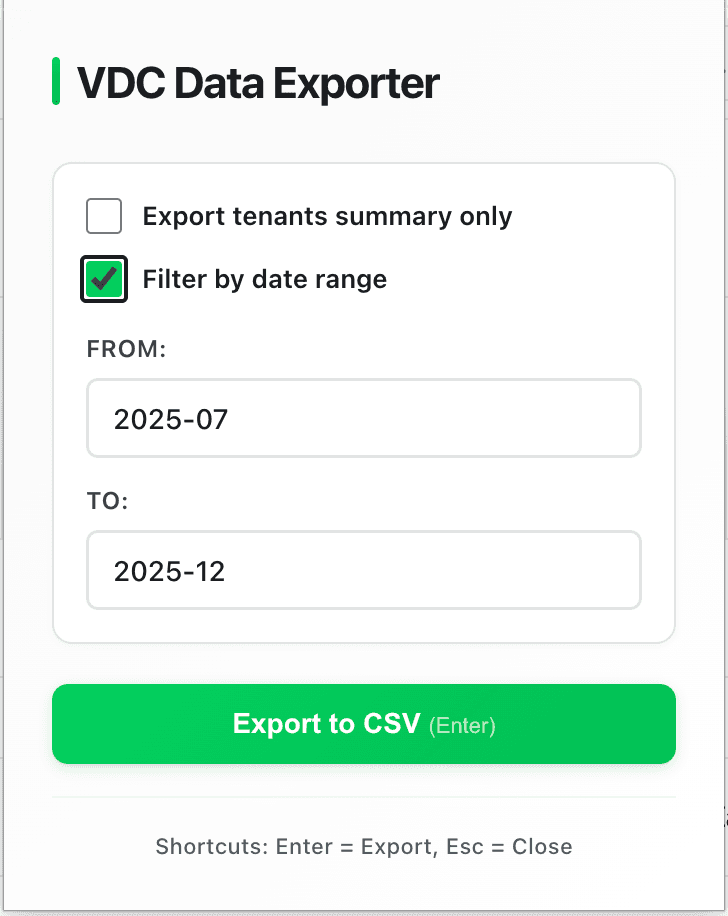 Once it is loaded, navigate to your VDC dashboard (either the main view or a specific tenant) and click the extension icon. You can filter by date range (useful for monthly billing cycles) and download your CSV.